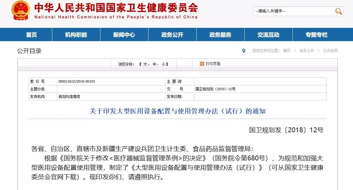 发布时间:2018-06-15继《大型医用设备配置许可管理目录(2018年)》印发后,6月13日,为规范和加强大型医用设备配置使用管理,国家卫生健康委员会联合国家药品监督管理局共同制定了《大型医用设备配置与使用管理办法(试行)》。